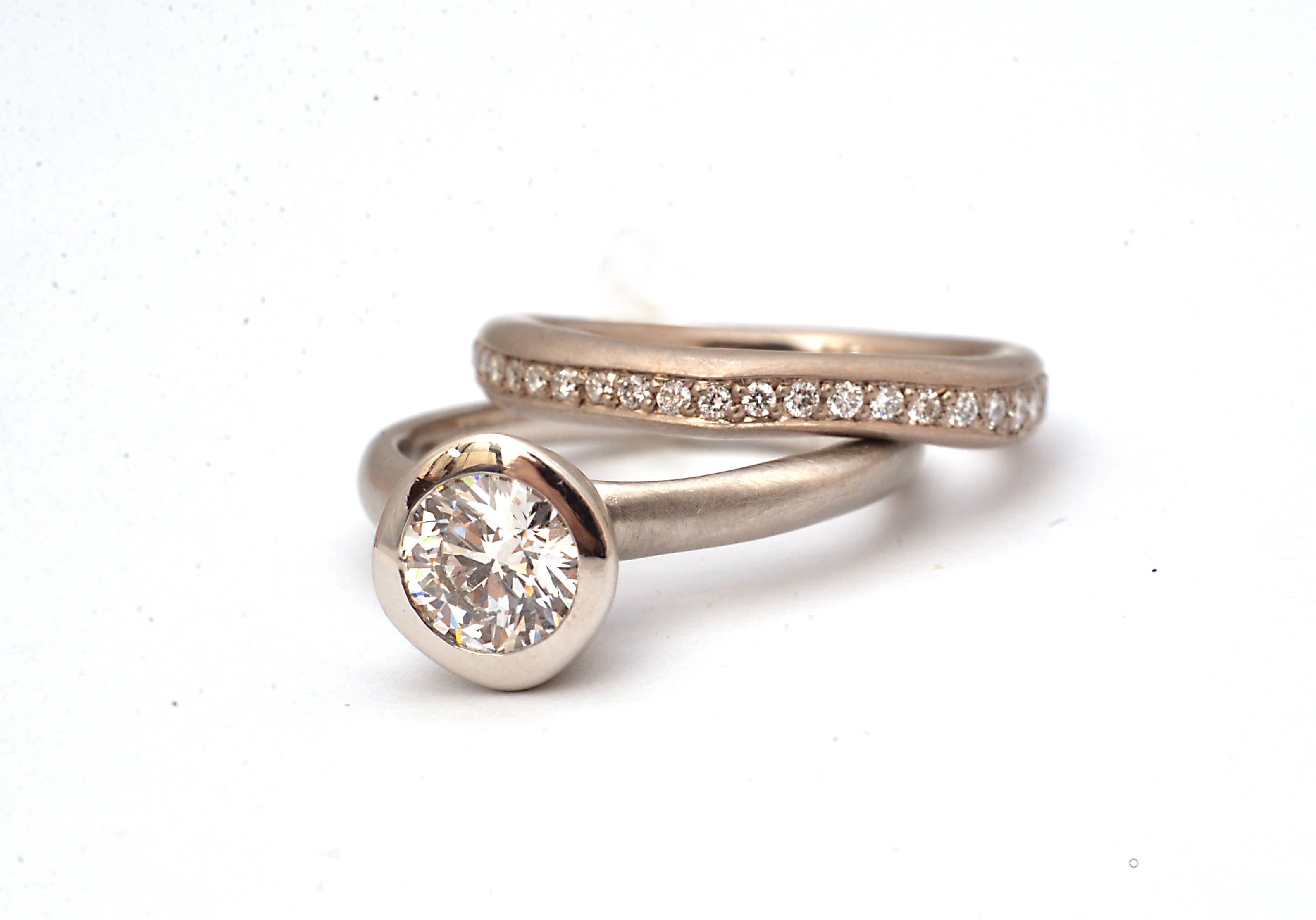 Auch wenn jedes Stück individuell entsteht, lassen sich bestimmte Tendenzen erkennen, die Marie Skrein aktuell beobachtet: „Nach einer Phase eher zarter Schmuckstücke wächst wieder die Bereitschaft, mehr Präsenz zu zeigen. Organische Formen und individuelle Oberflächen gewinnen an Bedeutung, ebenso wie breitere Ringe. Es geht um mehr Gewicht, mehr Charakter – und um eine stärkere persönliche Handschrift.“ Dabei zeichnen sich in der Materialwahl klare Verschiebungen ab: Gelbgold gewinnt spürbar an Bedeutung, während Roségold zunehmend in den Hintergrund tritt – eine Entwicklung, die sich nicht nur bei Eheringen, sondern auch bei Verlobungsringen zeigt, wo Weißgold immer häufiger durch Gelbgold ersetzt wird. Auch in der Formensprache bleibt Bewegung spürbar: Während sich der runde Schliff als zeitloser Klassiker behauptet, wächst zugleich das Interesse an markanteren Alternativen wie dem Baguette- oder Ovalschliff. Diese Tendenzen werden vereinzelt durch feine Farbakzente ergänzt. Vor allem Grün- und Gelbtöne setzen subtile Akzente, bleiben im Verlobungsring jedoch die Ausnahme – nicht zuletzt, da der Diamant aufgrund seiner besonderen Haltbarkeit weiterhin bevorzugt wird. Eine entsprechend besondere Wahl stellt in dem Zusammenhang der gelbe Diamant dar. Alternativ eröffnen Saphire in den entsprechenden Nuancen eine charaktervolle Möglichkeit, Farbe ins Schmuckstück zu integrieren.