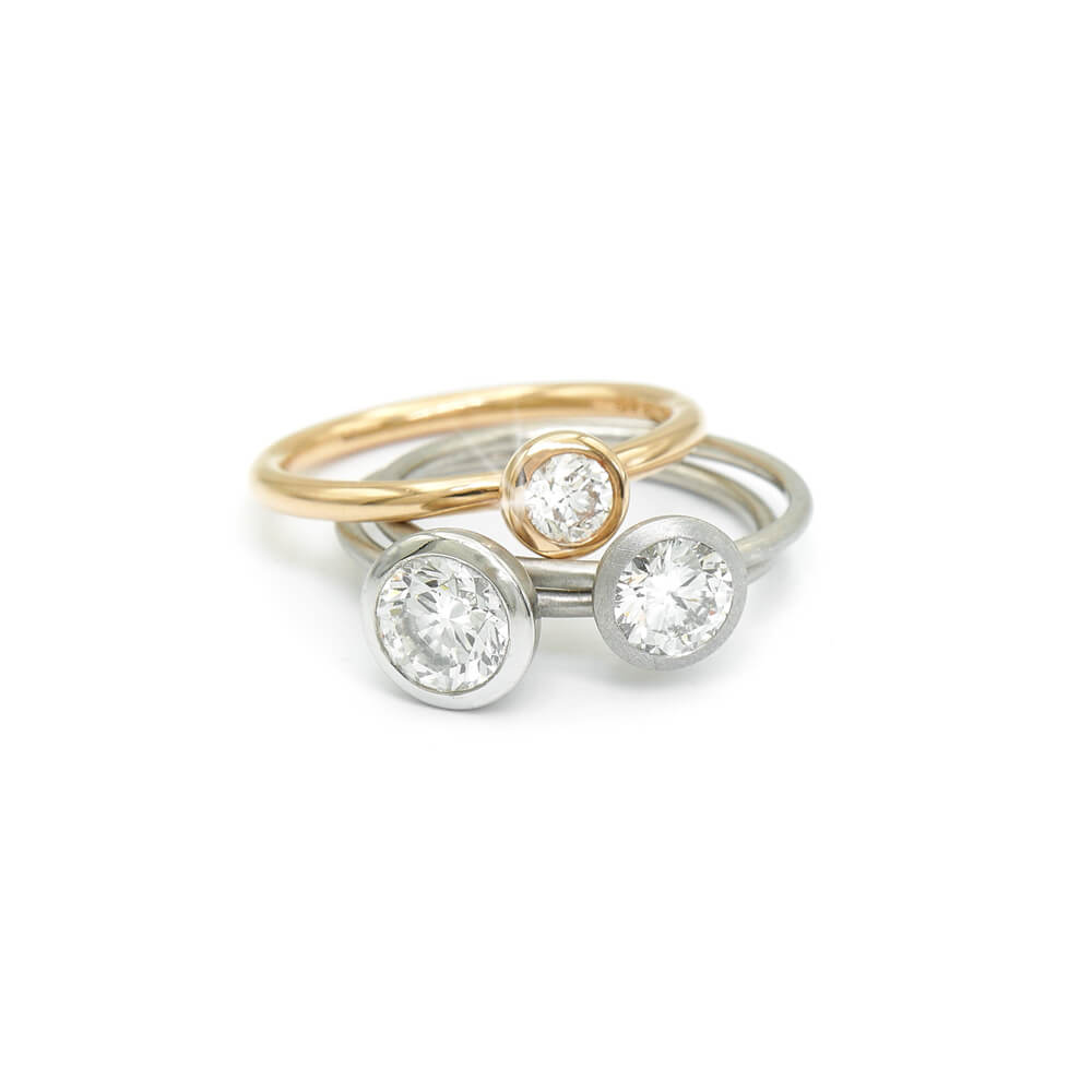 (v.l.n.r.) SKREIN* Guten Tag Solitär Ring um EUR 9180,- & Lava Memory Ring mit Diamanten um EUR 3690,- // SKREIN* Only Solitäre aus Fairem Gold ab EUR 3470,-
