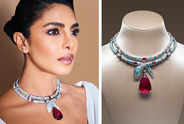 Im Zentrum des Abends stand die Enthüllung des außergewöhnlichen Serpenti Maharani Colliers. Dieses High-Jewelry-Meisterwerk, inspiriert von den mächtigen Herrscherinnen Indiens, vereint majestätische Anmut und handwerkliche Virtuosität: Ein 109,27-Karat-Rubellit in lebendigem Pink, umschlungen von pavé-gefassten Diamanten und Türkisakzenten, verkörpert Transformation und die zeitlose Eleganz der Serpenti-Linie.