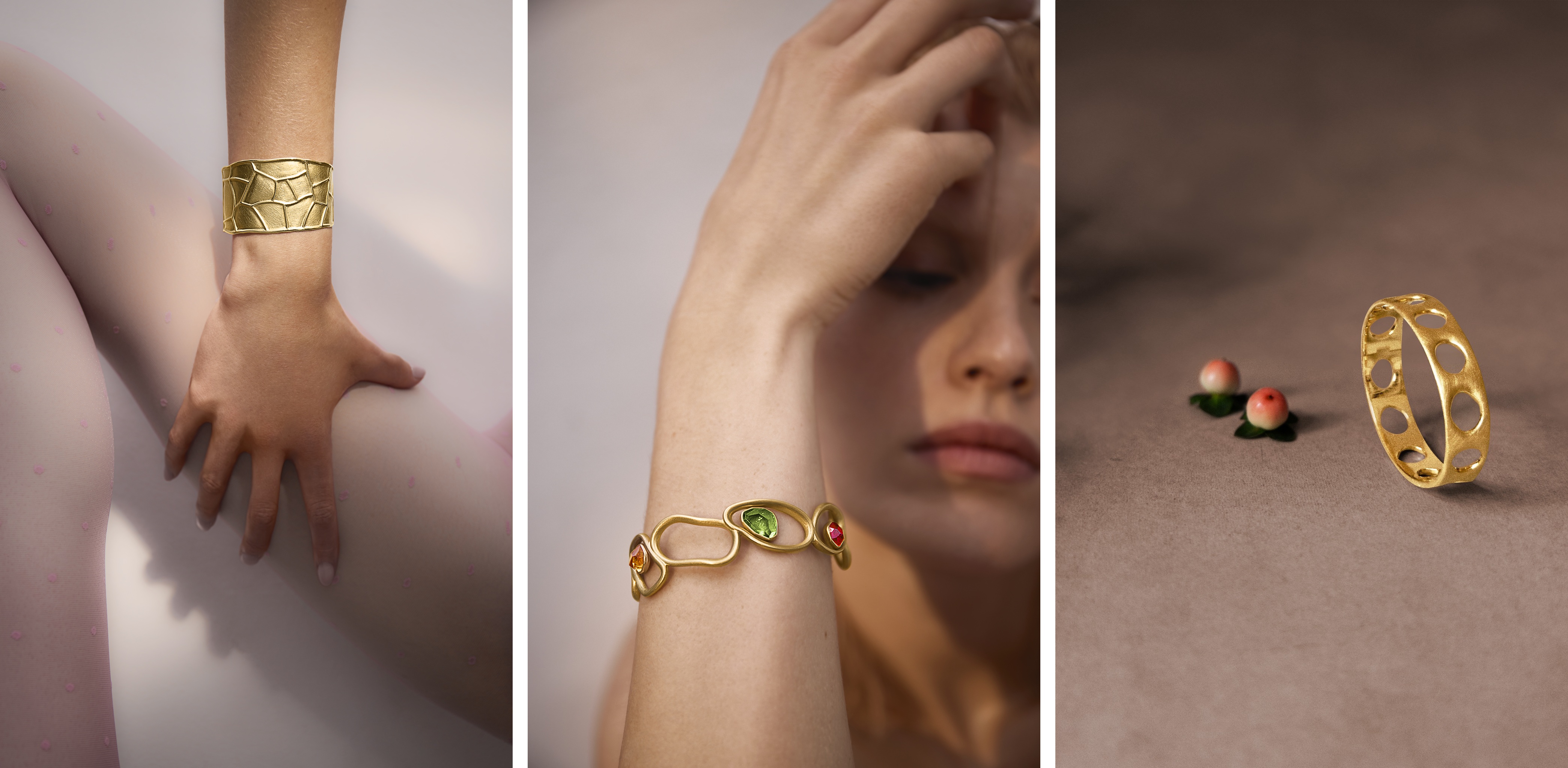 (v.l.n.r.) Giraffen Armreifen aus Fairem Gold um EUR 18.590,- // Lava Rocks Armreifen aus Fairem Gold mit Edelsteinen um EUR 16.190,- // Lotus Armreifen aus Fairem Gold um EUR 20.790,-