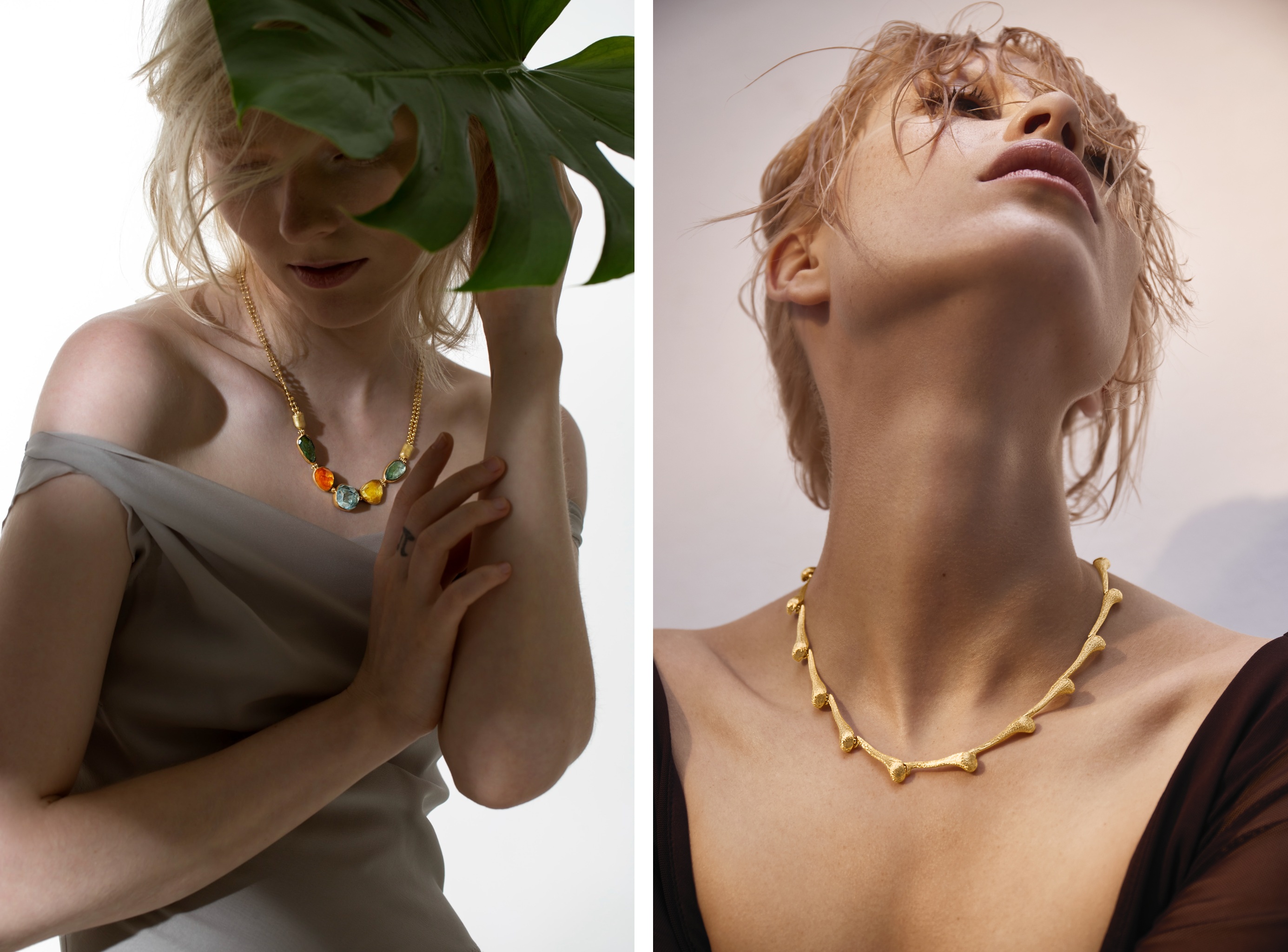(v.l.n.r.) Collier aus Fairem Gold mit 5 Edelsteinen im Rocks Schliff um EUR 19.690,- // Drop Collier aus 18kt Gold um EUR 17.890,-