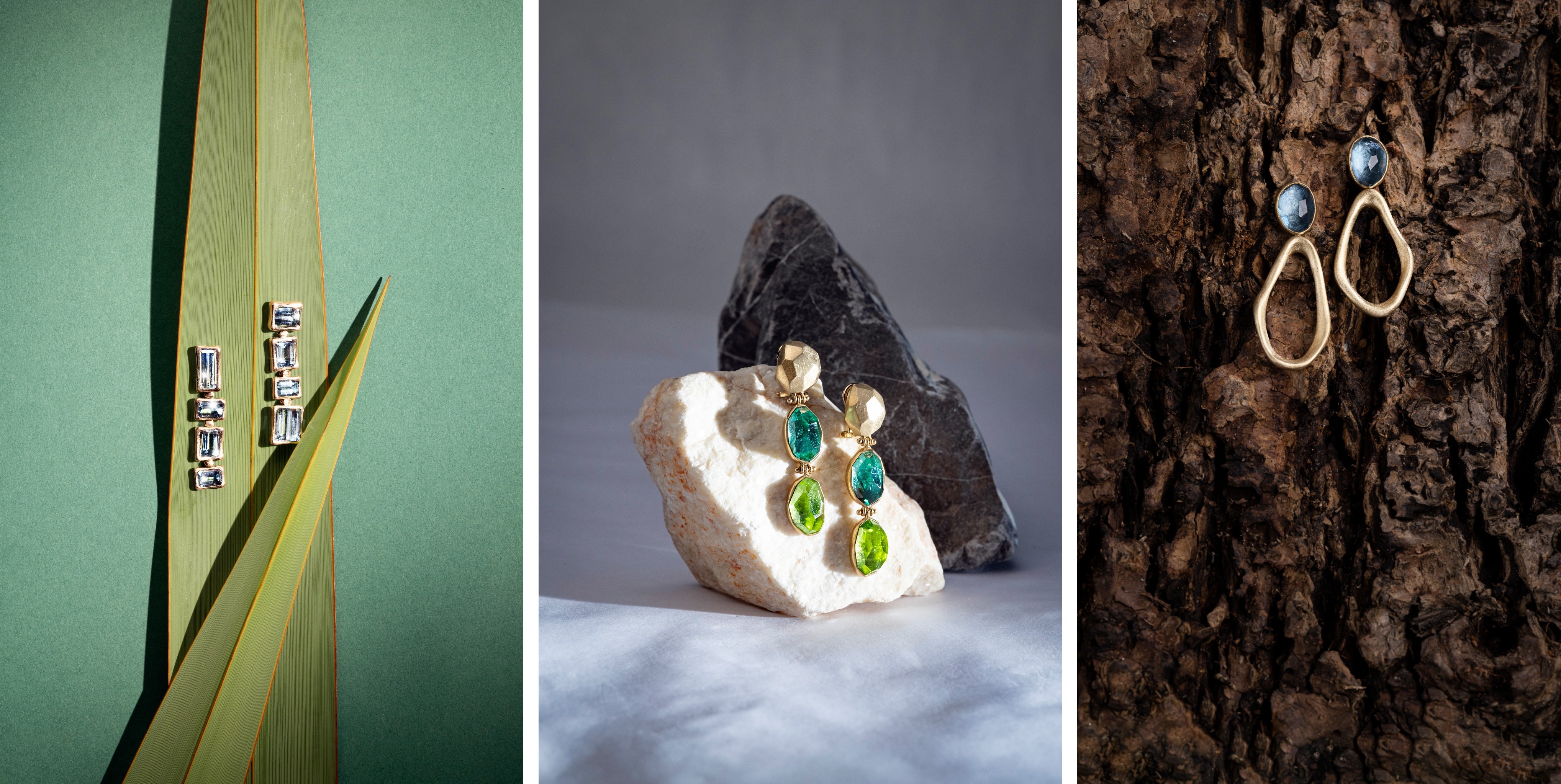 (v.l.n.r.) Baguette Ohrgehänge aus Fairem Gold mit Aquamarinen um EUR 21.290,- // Solid Rocks Ohrgehänge aus Fairem Gold mit Edelsteinen im Rocks Schliff um EUR 12.290,- // Lava Rocks Ohrgehänge aus Fairem Gold mit Edelsteinen ab EUR 9.150,-