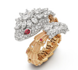 High Jewelry Serpenti-Ring aus 18 Karat Gelb- und Weißgold mit 28 Diamanten im Marquiseschliff (2,75 ct), 8 runden und birnenförmigen Rubinen (0,28 ct) sowie pavé-gefassten Diamanten (1,37 ct)