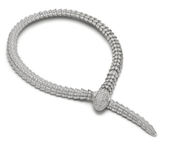 High Jewelry Serpenti-Halskette aus 18 Karat Weißgold mit 2 Diamanten im Birnen-Brillantschliff (1,07 ct) sowie pavé-gefassten Diamanten (68,46 ct)