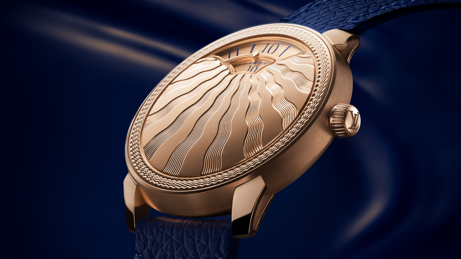 Die Tambour Convergence Guilloché unterstreicht die gestalterische Reife und das dekorative Savoir-faire der Maison Louis Vuitton. In den Genfer Ateliers vollständig gefertigt, dient das Gehäuse aus Roségold als Träger traditioneller, handgedrehter Guillochage-Techniken, die mit außergewöhnlicher Tiefe und Präzision ausgeführt werden. Die Zeit wird über rotierende Scheiben für Stunden und Minuten angezeigt, eingefasst von einem skulpturalen Fenster, das historische Referenzen mit zeitgenössischer Gestaltung verbindet. Als dritte Kreation der Tambour Convergence Linie verdeutlicht dieses Modell den Anspruch der Maison, Métiers d’art und zeitgenössische Uhrmacherkunst miteinander zu verbinden.