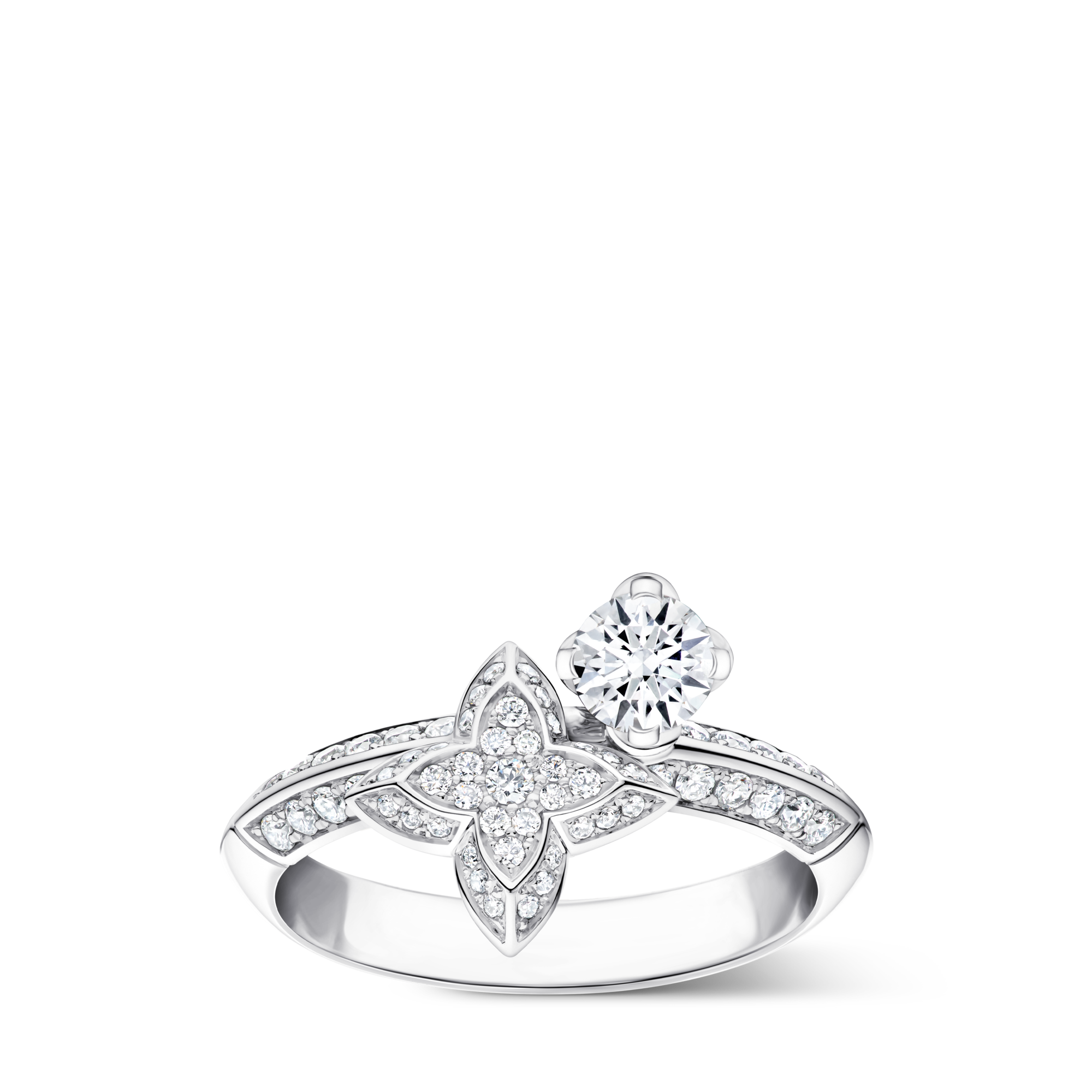Im Zentrum von LV Diamonds steht ein exklusiver Diamantschliff, dessen Entwicklung mehrere Jahre intensiver Forschung erforderte. Der LV Monogram Star Schliff – die kostbarste Interpretation des 1896 von Gaston Vuitton entworfenen Monogram Canvas – intensiviert das Leuchten jedes Diamanten und bringt die vollkommene Symmetrie der Blütenblätter mit beeindruckender Tiefe und Strahlkraft zur Geltung. Diese technische Meisterleistung setzt außergewöhnliche Rohsteine voraus: Die 53 Facetten jedes Diamanten – im Vergleich zu den 57 eines klassischen Brillantschliffs – wurden mit höchster Präzision ausgerichtet, von Hand geschliffen und poliert, um das Licht optimal einzufangen.