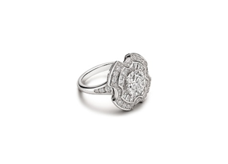 High Jewelry Ring aus 18 kt Weißgold mit 1 rundem Brillanten (E VVS2 – 2,50 ct), 20 Fancy Shape Treppenschliff-Diamanten und pavé-Diamanten.