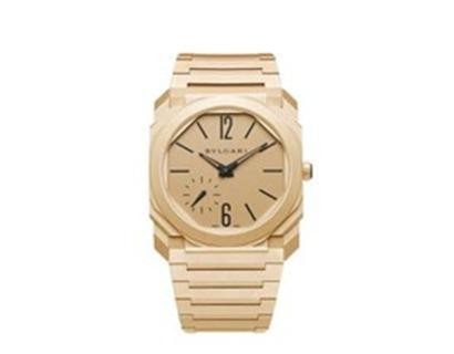 Octo Finissimo Automatic Uhr mit ultraflachem Manufakturwerk (2,23 mm), automatischem Aufzug mit Platin-Mikrorotor, sandgestrahltes 18 kt Gelbgoldgehäuse und -armband, Zifferblatt Gelbgold, Zeiger und Indizes schwarz