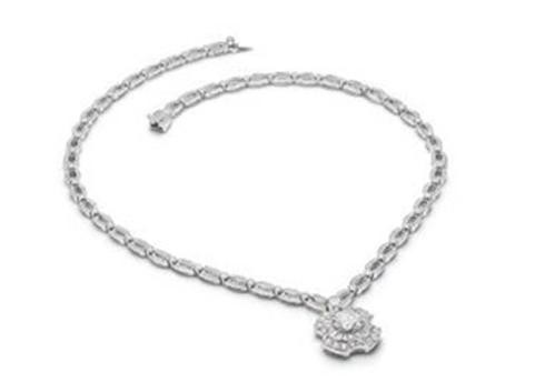 High Jewelry Collier aus 18 kt Weißgold mit 1 rundem Brillanten (E VS1 – 2,51 ct), 12 Treppenschliff-Diamanten und pavé-gesetzten Diamanten (D–F IF–VVS – 4,66 ct)