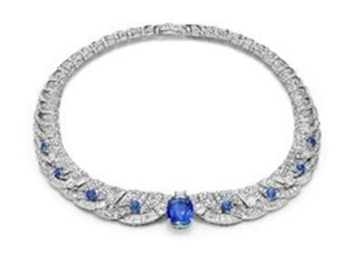 High Jewelry Saphir-Collier, 18 kt Weißgold, Cushion Saphir 14,06 ct, 3 runden Diamanten (F VVS1 – 1,76 ct), 8 runden Saphiren (4,05 ct), 6 runden Diamanten (D VVS – 2,31 ct), 84 Treppenschliff-Diamanten (E–F VVS–VS – 3,62 ct) und pavé-gesetzten Diamanten (D–F IF–VVS – 16,82 ct).