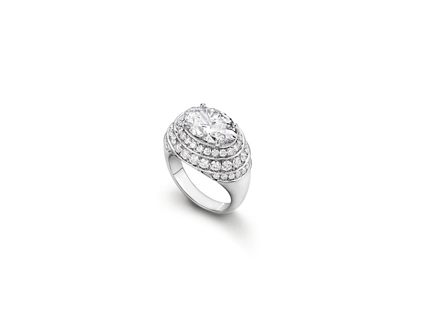 High Jewelry Ring aus Weißgold mit 1 ovalem Diamanten (E VS1 – 4,45 ct) und pavé-gesetzten Diamanten (D–F IF–VVS – 1,77 ct)